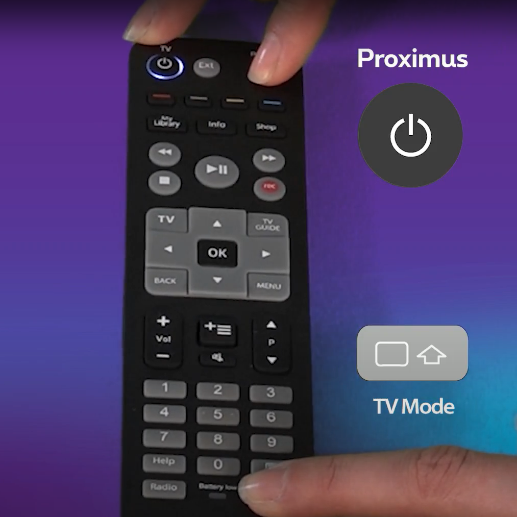 - Drücken Sie nun abschließend die Taste "TV-Modus" unten rechts, während Sie die Proximus-Taste oben rechts drücken.