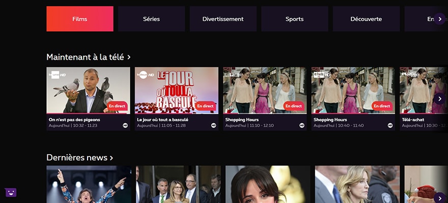 C’est par ici que vous commencez votre visite. Tout d’abord, avec la partie « Maintenant à la TV », vous obtenez un aperçu des diffusions des dix premières chaînes. Juste au-dessus, vous retrouvez différents boutons, où sont regroupés les différents programmes par catégorie. De cette manière, vous recevez des suggestions pour savoir quoi regarder, en fonction de vos goûts du moment :