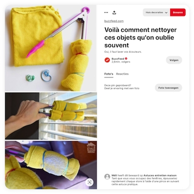 Heb je rolluiken? Dan is er een eenvoudige manier om opgehoopt stof te verwijderen. Neem een keukentang en bevestig met behulp van elastische banden een zeemvel op elk uiteinde van de tang (zie foto hiernaast).