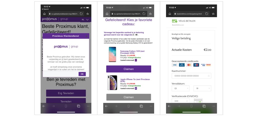 Je hebt bijvoorbeeld een smartphone of een mooie reis gewonnen en maar enkele minuten de tijd om de prijs te ‘claimen’. Daarvoor moet je op een link klikken en een (vaak kleine) som online betalen. Of je moet de nodige persoonsgegevens doorspelen. Of een korte enquête invullen. Altijd via een valse website, die heel betrouwbaar lijkt.
